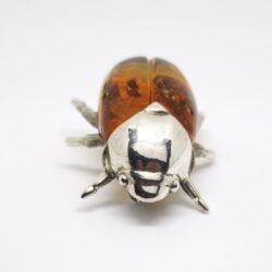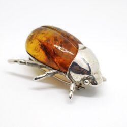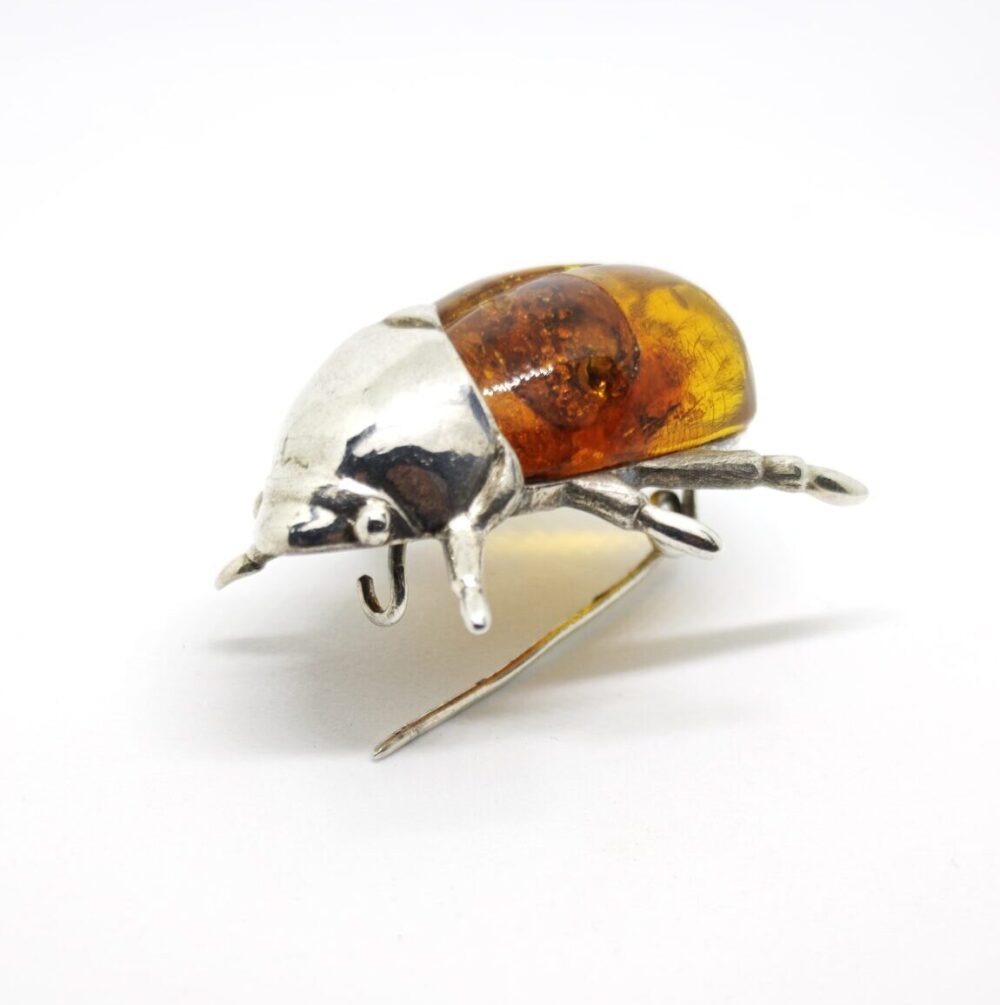 Distinctive brooch crafted in 925 sterling silver, designed in the form of a scarab beetle and set with natural amber. The warm amber body, with its organic inclusions, creates a unique pattern in each piece, making every brooch one of a kind.