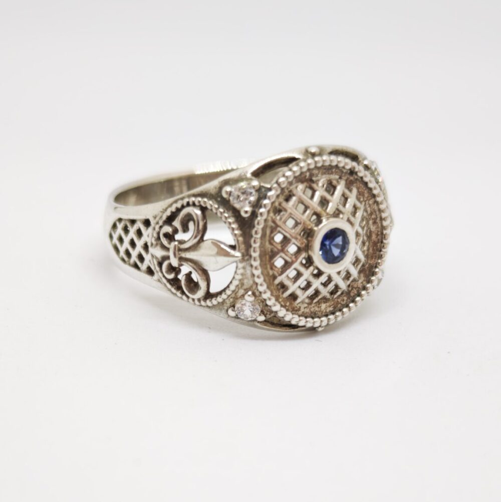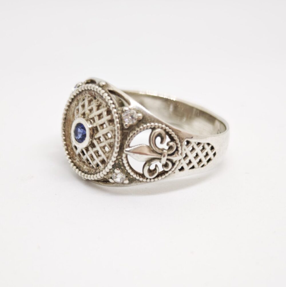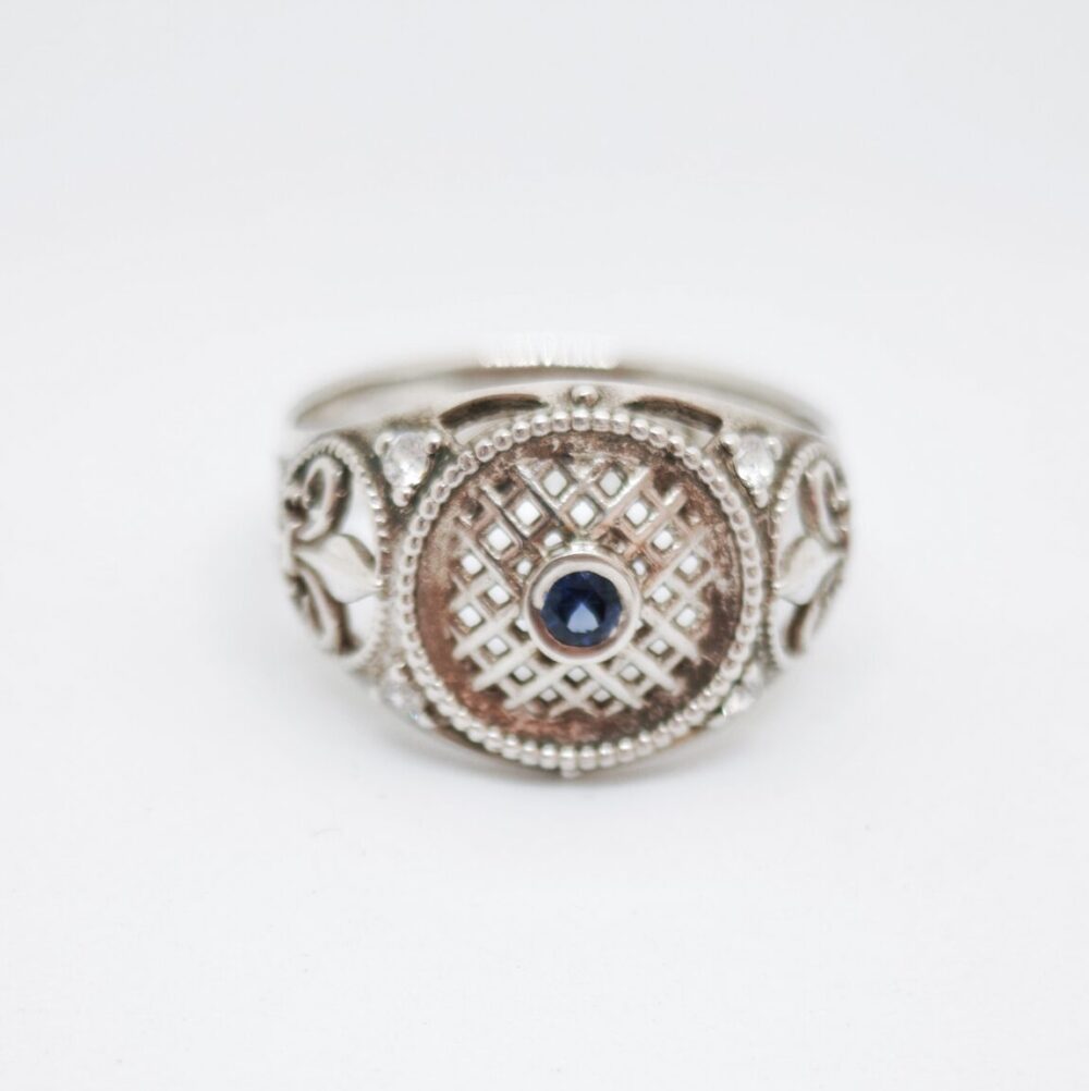 Elegante anillo elaborado en plata de ley 925, engastado con un zafiro natural en el centro y topacios blancos en los laterales. Su diseño estilo sello de inspiración vintage, con detalles ornamentales y estructura calada, aporta a la pieza un carácter elegante y distintivo.