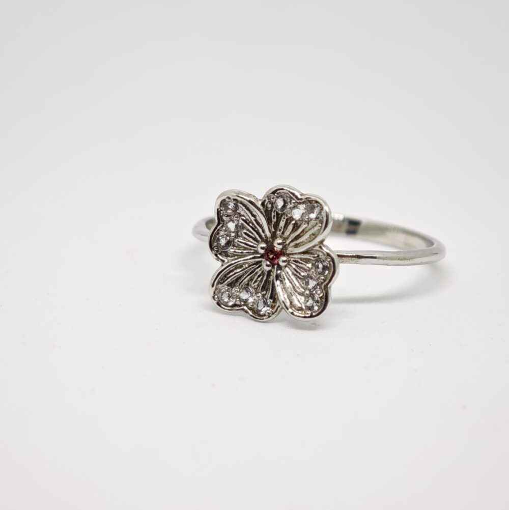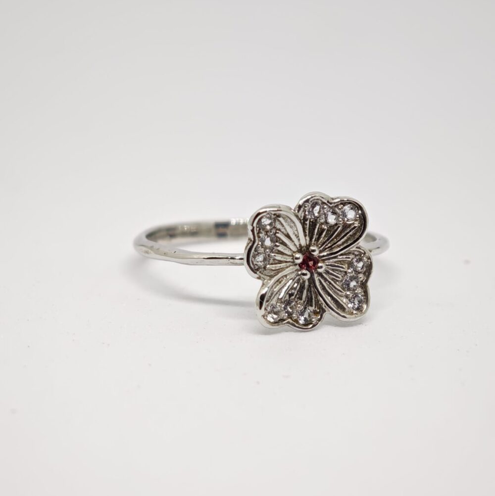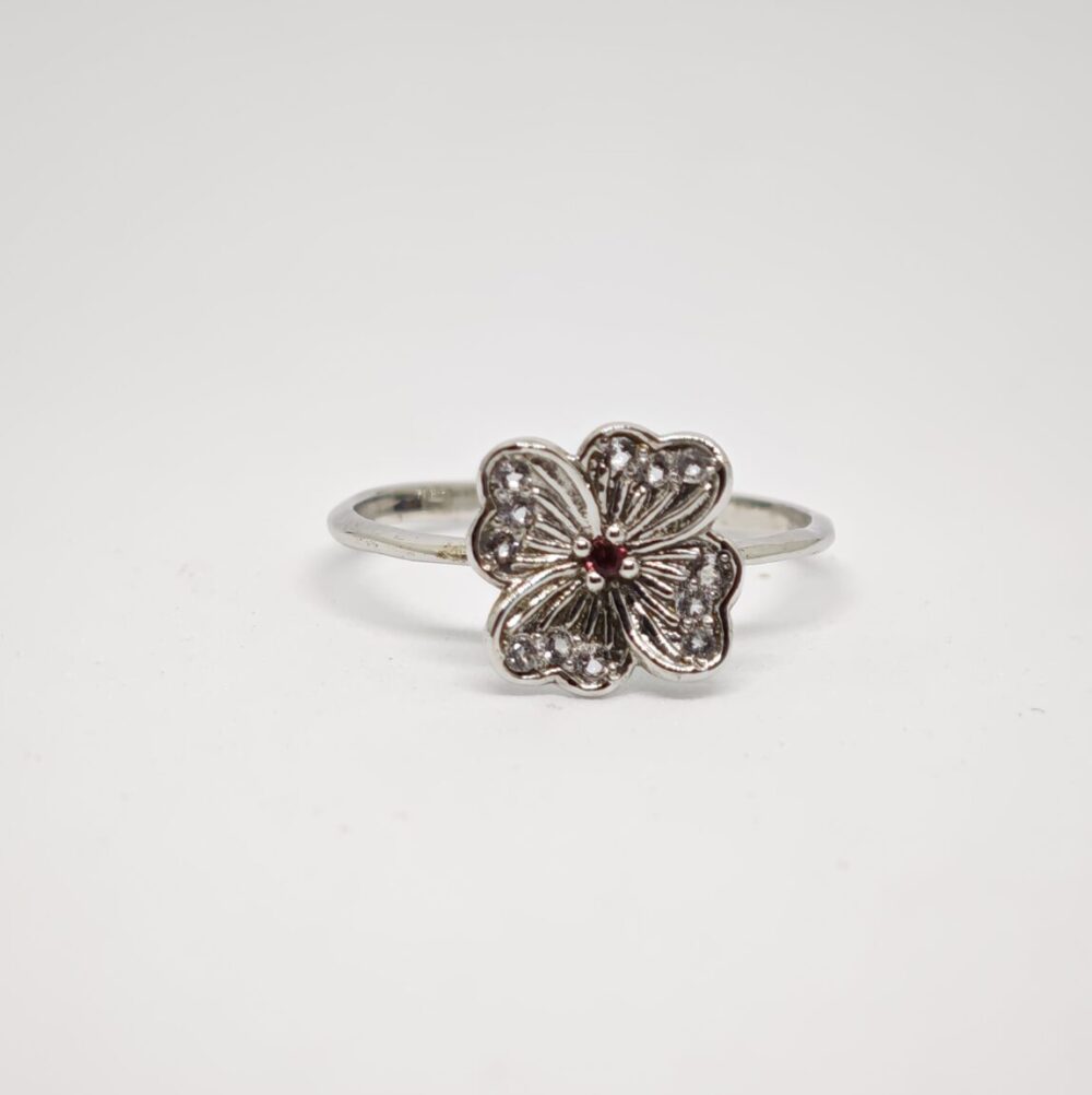 Elegante anillo elaborado en plata de ley 925, con un diseño ornamental decorado con topacios blancos y un rubí central que aporta un contraste de color sofisticado.