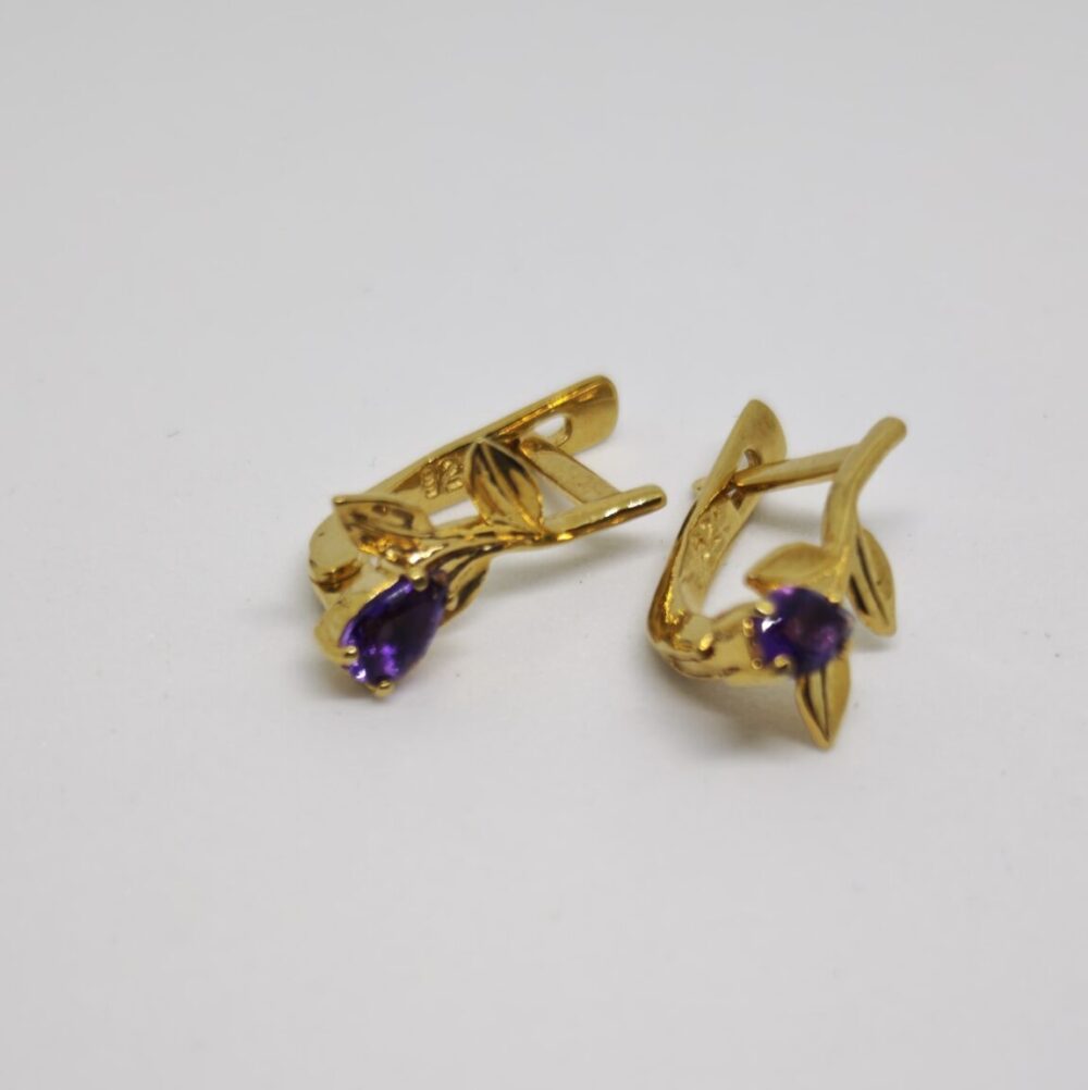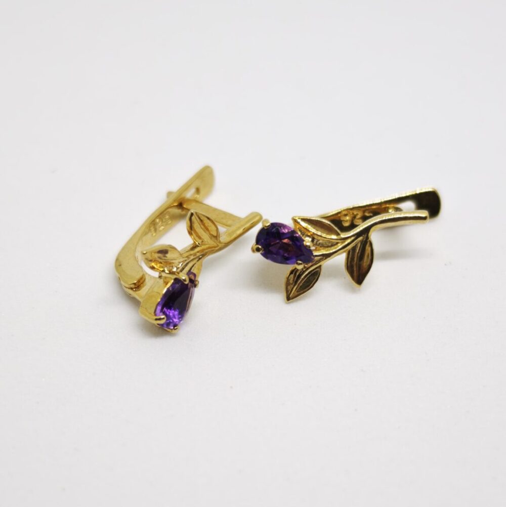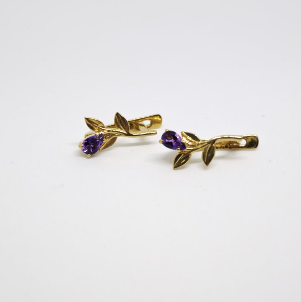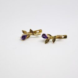 Elegantes pendientes elaborados en plata de ley 925 chapada en oro de 18K, decorados con amatistas naturales de intenso color violeta. Su diseño floral refinado con delicadas hojas crea una composición equilibrada y sofisticada.